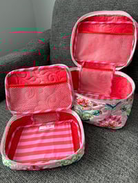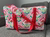 Travel with this beautifully quilted duffle and train case set - Duffle bag measures approximately 19" wide, 12" high, and 10" deep. Large train case dimensions are 10.5" long, 7.5" deep, and 6.5" high. Small train case dimensions are 8.5" long, 5.5" wide, 2.75" high.