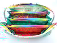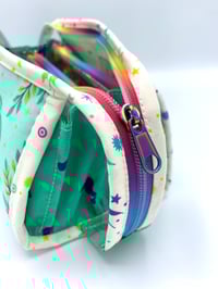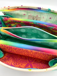 This fantastic barrel style bag features sewing themed exterior fabric along with coordinating prints from the Homemade line from Tula Pink. The zippered pockets are all lined with aqua dots that are bright enough to see your stored items. There is one long eternal zipper that acts as a handle from either end, 3 internal zippered pockets, and 4 separated sections. Each zippered compartment is fully lined and secures your items in a fully enclosed pocket. Comes with standard solid color zippers, but may be upgraded to rainbow zipper tape and pulls for $5. Please add the rainbow zipper pull/tape listing to your order if you wish to upgrade your zippers.